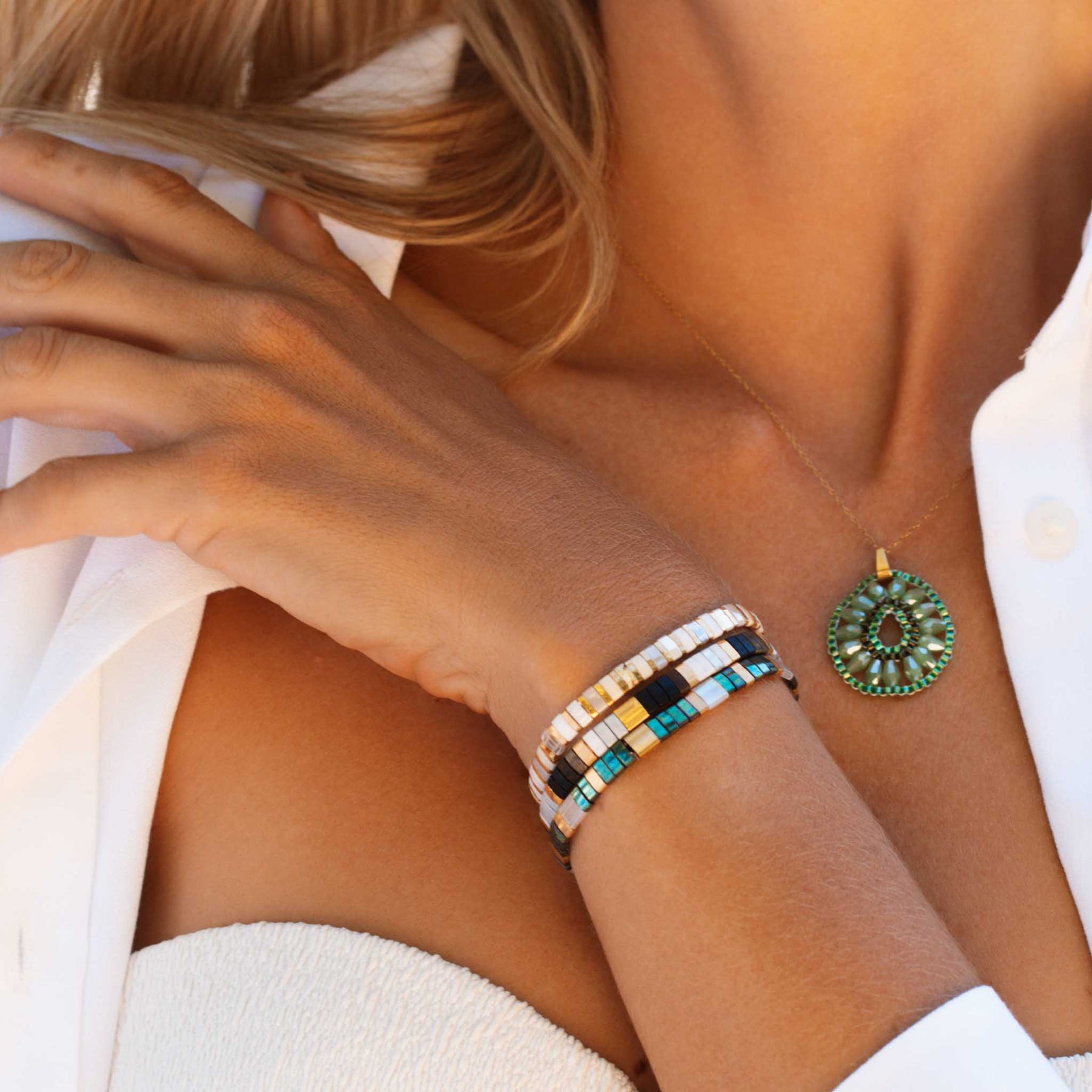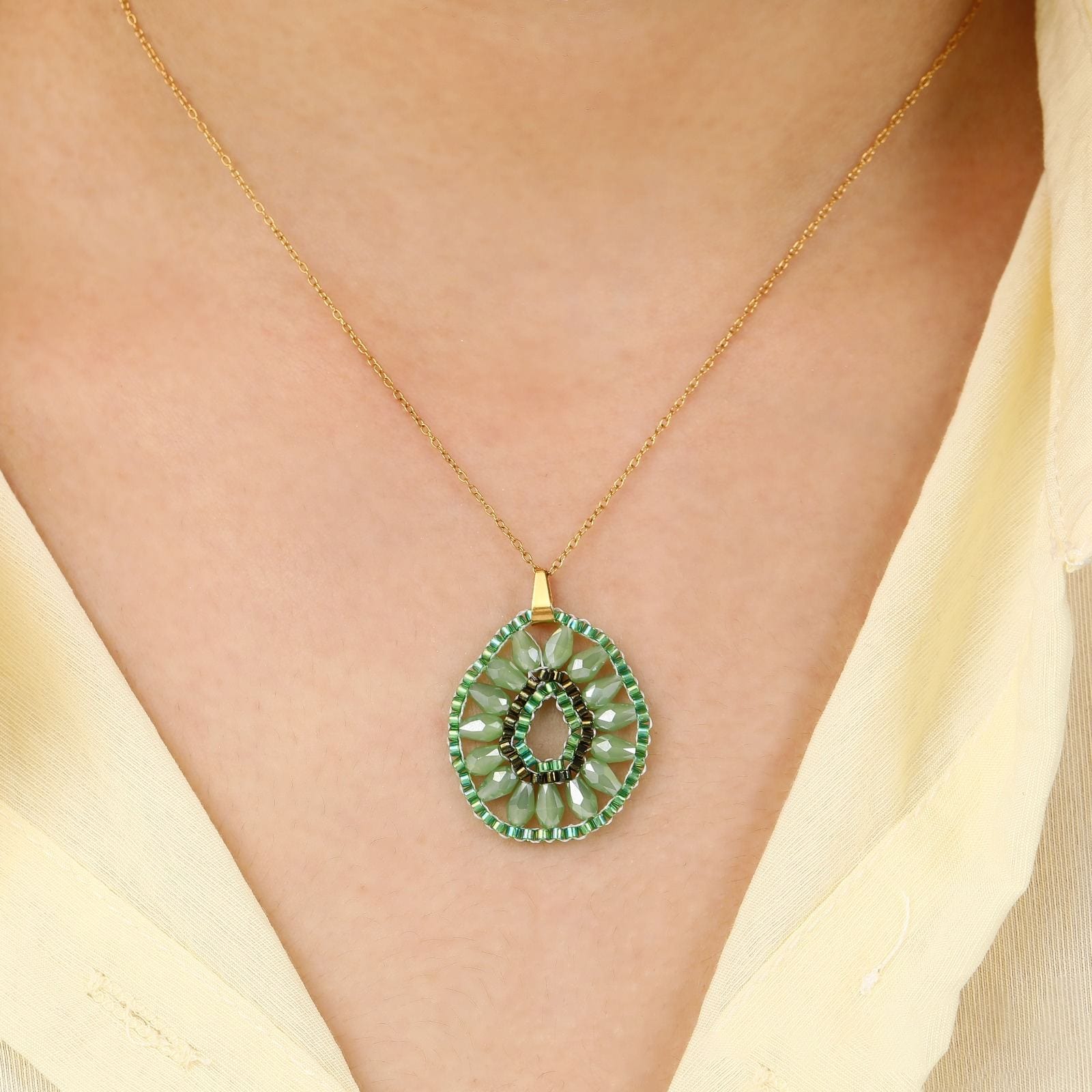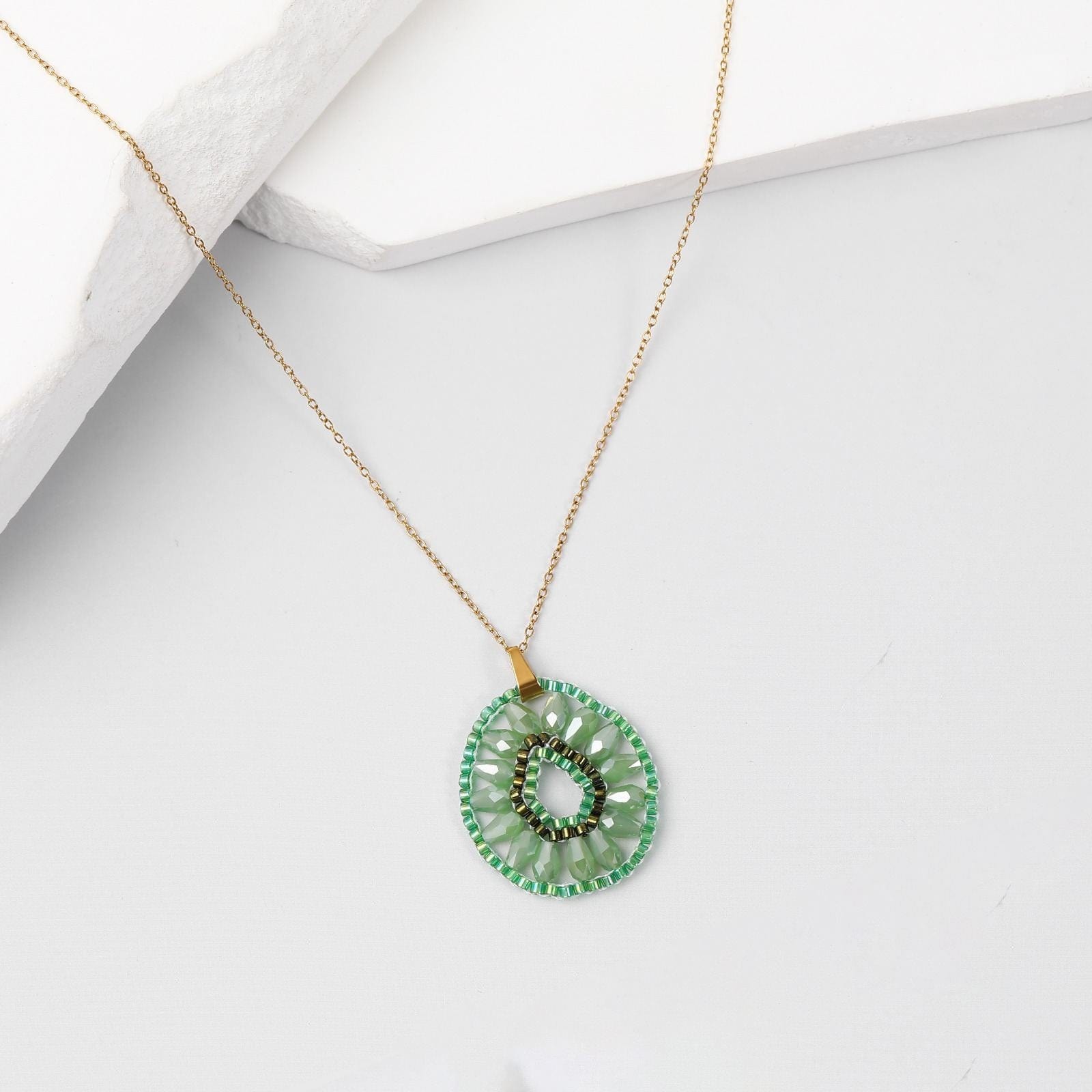 #EclatDePrintempsUn pendentif tissé à la main avec de véritables perles Miyuki du Japon, monté sur une chaîne en acier inoxydable doré. Léger, raffiné, et résistant. Un bijou délicat qui sublime toutes vos tenues.