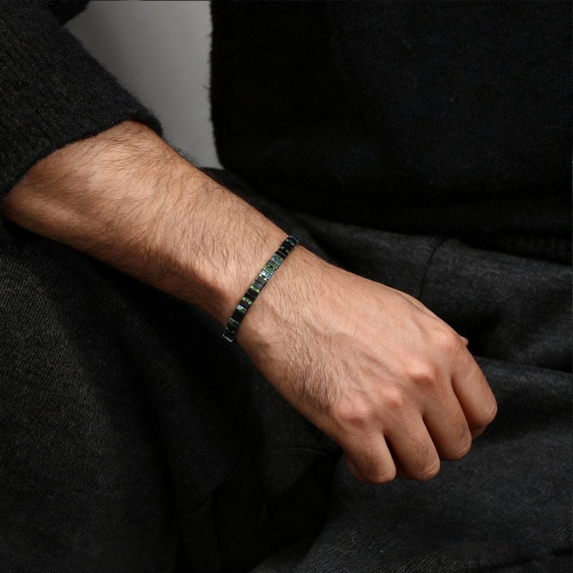 Ses nuances intenses de noir, vert émeraude, bleu irisé et touches nacrées créent un jeu de lumière captivant et moderne. Porté seul pour un style affirmé ou combiné, il s’intègre avec élégance à un style masculin.