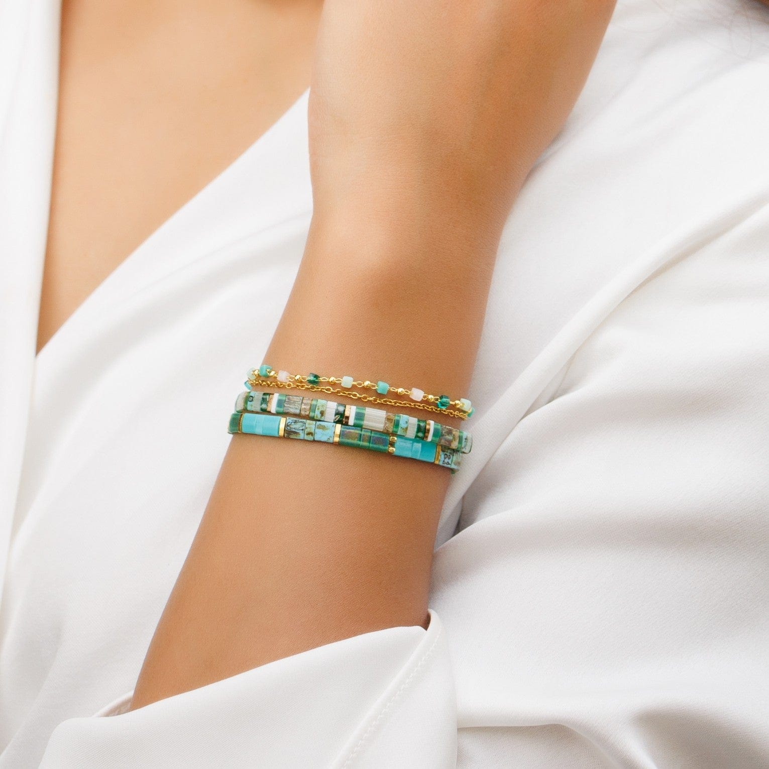 #PAQUESLa parure verte Ela associe les bracelets de perles plates Ela, Olivia et Lef, confectionnés à la main avec des perles Miyuki du Japon et des pierres naturelles, réputées pour leur finesse et leur éclat subtil.