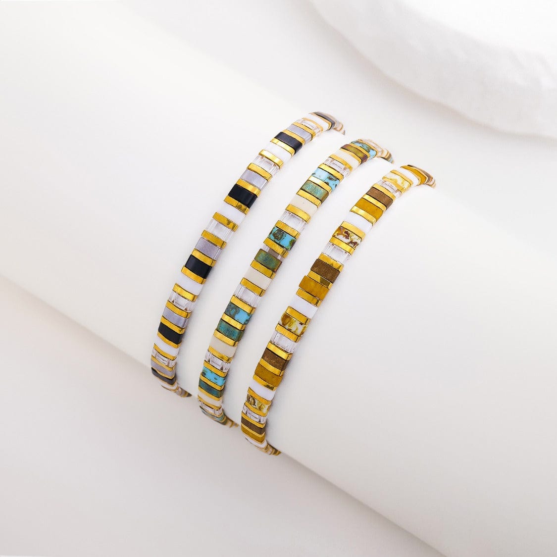 #PAQUESLa parure Liana réunit trois bracelets de perles plates, réalisés à la main avec des perles Miyuki du Japon, reconnues dans le monde entier pour leur éclat et leur finesse.